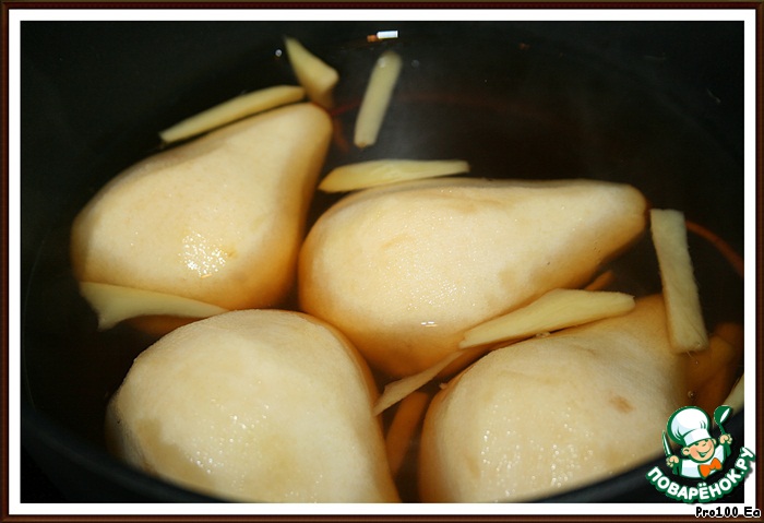 9. Вынуть груши из воды. 1/2 воды (вынуть имбирь) соединить с крахмалом.