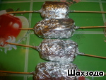 Завернуть каждый шашлычок в фольгу, запекать в духовке при 200 град. до готовности (30-40 мин.)