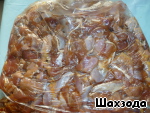 Мясо режем на маленькие кусочки, складываем в полиэтиленовый пакет, добавляем туда соус-маринад 2 ст. л. Пакет перевязываем ниткой, потрем пакет руками (такая идея быстрого маринования идеально подходит для куриных крылышек или мяса для шашлыка)