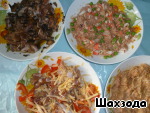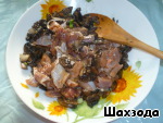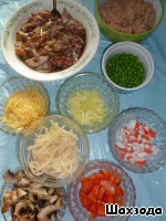 Начинка №1. Грибы и мелко нарезанный лук обжарить вместе на сливочном масле. Маринованное мясо разделить на 2 части. Смешать с одной частью грибы с луком (посолить, поперчить по вкусу)