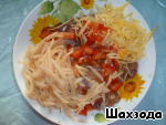 Начинка №2. Смешать вторую часть маринованного мяса с сыром, помидорами, картофелем, майонезом