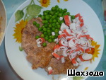 Начинка №4. Вторую часть фарша смешать с горошком, крабовыми палочками