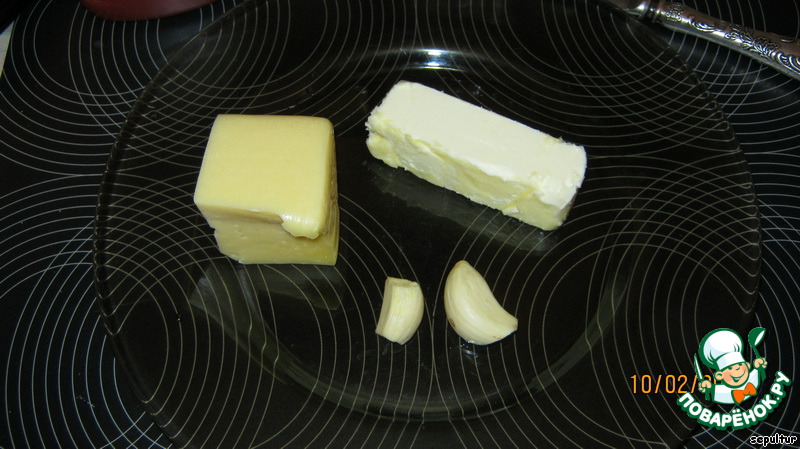 Подготавливаем смесь: сыр трем, чеснок давим, добавляем масло...
