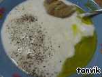 5.Сметану смешать с йогуртом, оливковым маслом и приправить лимонным соком, горчицей, солью и молотым перцем.