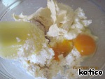 Добавить сахар, сливочное масло, яйца, размешать до получения однородной массы.