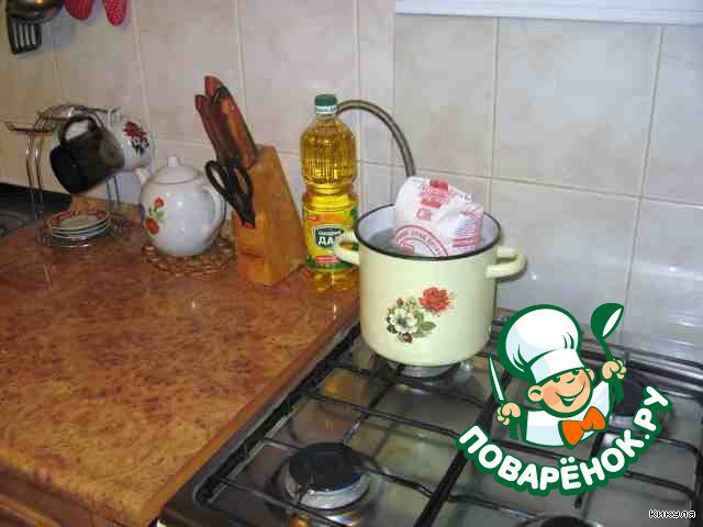 Упаковку зашить цыганской иглой и варить 1,5 часа. После чего вынуть, дать остыть и поставить в холодильник на ночь. А утром разрезать упаковку и достать содержимое.