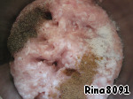 В куриный фарш добавить соль, перец и другие специи по Вашему вкусу (у меня мускатный орех). Хорошо перемешать.