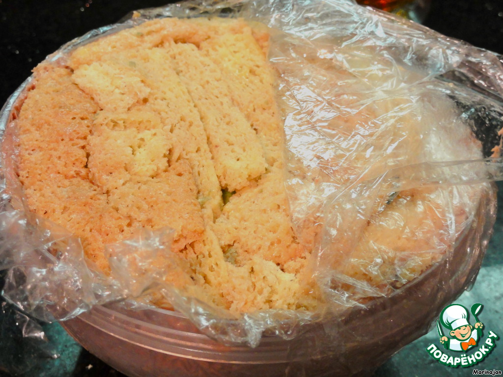 Пропитываем его коньяком (я его не разводила), получился такой слегка опьяняющий контраст.