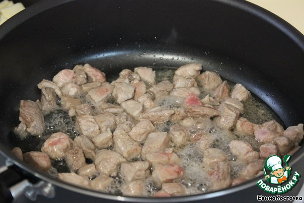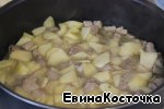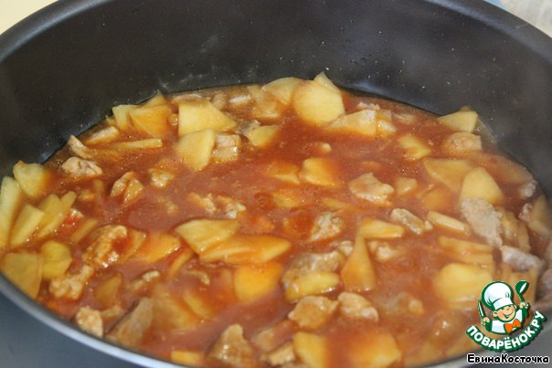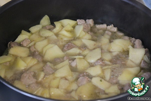 • Бульон (можно из кубика) и яблоки добавить к мясу. Тушить под крышкой.