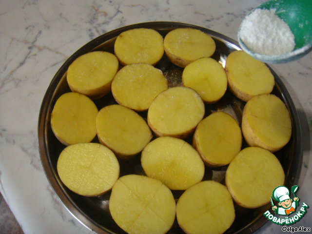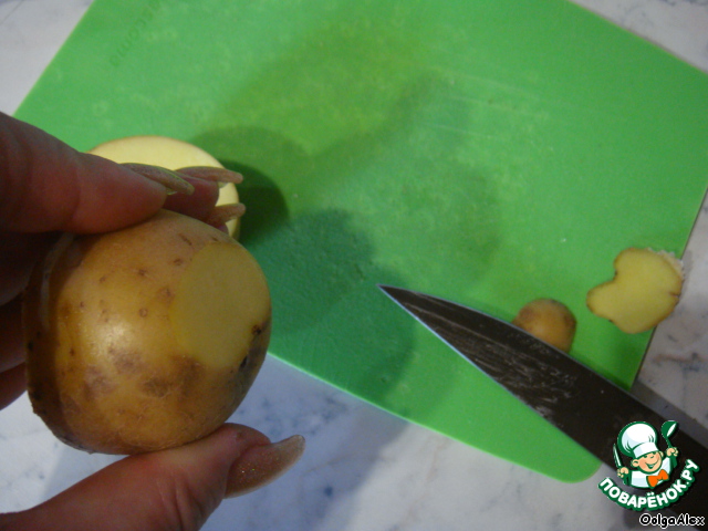 Сырой вымытый картофель разрезаем напополам, срезаем низ (чтобы половинки "стояли"),