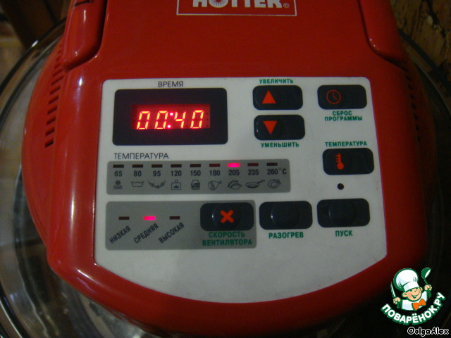 Устанавливаем время: 40 минут; скорость вентилятора: средняя; температура: 205 градусов и включаем аэрогриль.
