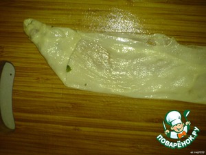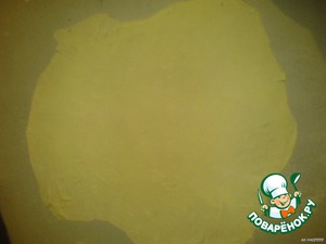 Получившийся круг разделить на два. Смазать топленым сливочным маслом одну половинку и сложить её вдвое в длину и опять промазать маслом.