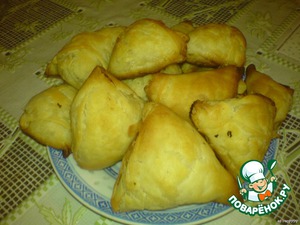 На один конец положить чайную ложку с верхом начинки. (У меня был обжаренный фарш с луком и помидорами). И загнуть уголочек. -