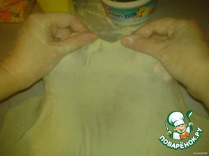Теперь обмазав руки растительным маслом, начинаем его растягивать на столе, на весу, приподнимая края до очень тонкого состояния, поверьте, это не сложно.
