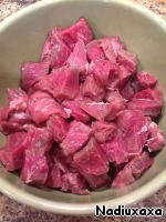 Мясо режем кубиком. Жарим шкварки. У меня мясо было с жирком, поэтому я решила его использовать для получения шкварок. Когда жир выделится, вынимаем шкварки и в жире обжариваем мясо. Мясо должно обжариться, а не тушиться, поэтому если мяса много, обжариваем его в несколько приемов.
