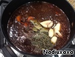 Все заливаем 1 стаканом говяжего бульона и бутылку вина. Добавляем специи (у меня смесь трав провансаль), соль, перец, лавровый лист и слегка придавленный чеснок. Перемешиваем и оставляем тушить на медленном огне на 3-4 часа. Мешать при этом не надо.