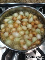 2,5 часа проводим в мыслях о прекрасном, Париже... Можно бокальчик вина за это время оформить))) Ну все, хватит пьянствовать, пора обратно на кухню! Мелкий лук (у меня он называется "pearl onions") опускаем в кипящую воду на минутку. И сразу обдаем холодной водой. Затем часть луковицы, где корень, обрезаем. Беремся пальцами за другой конец луковицы и выдавливаем ее из шелухи.