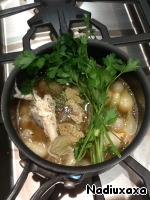 Затем обжариваем лучок в смеси сливочного и оливкового масла, пока подрумянится. Затем добавляем примерно 100 г бульона и специи (я сделала мешочек из марли с травками провансаль), лавровый лист, соль, перец и свежую зелень петрушки. И после закипания на медленный огонь на 50-60 минут.