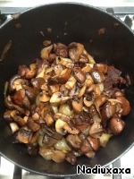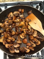 Затем грибы. Их режем на 4 части и обжариваем в смеси сливочного и оливкового масел до золотистого цвета. Мелко грибы не режьте ни в коем случае, т. к. они потеряются в конечном блюде.