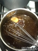 Приступим к соусу. Когда винно-мясная ароматная жидкость закипит, в нее кидаем beurre manie (комочек масла, перемешанного с мукой (примерно 1 ст. л. масла на столько же муки)). Венчиком перемешиваем до полного растворения и ждем, пока соус загустеет.