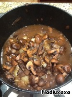 Итак, прошли 3-4 часа... Мясо скидываем на дуршлаг. Жидкость ставим на огонь, а из мяса выбираем морковь и лук. Они уже все отдали блюду и больше не нужны. Мясо кидаем обратно в кастрюлю. Туда же - лучок и грибы.