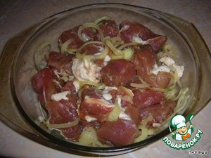 Порезать мясо на куски. Добавить винный уксус, соль, молотые черный и красный перец. Репчатый лук порезать кольцами. Лук добавить в мясо, перемешать и оставить на 3-4 часа в холодильник.