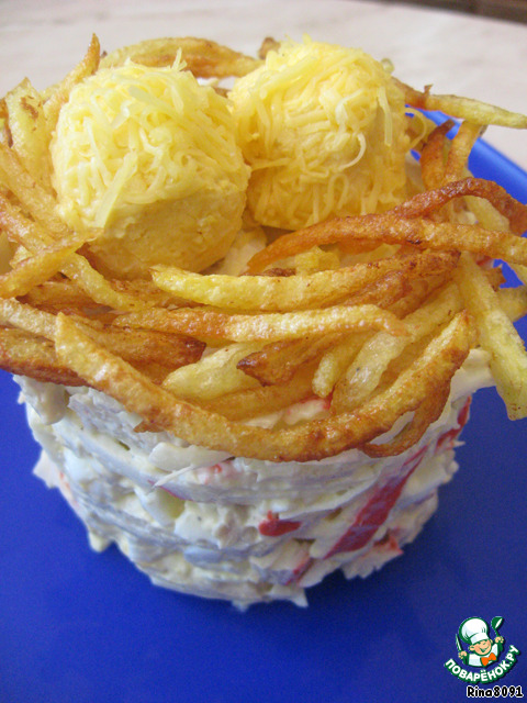 Возьмем круглую формочку (я их вырезала из обычных пластиковых бутылок с водой), поставим ее на тарелку, заполним салатом. Осторожно снимем. Сверху из картофеля выложим конструкцию напоминающую гнездо. В центр поместим несколько "яиц" из сыра и желтков. Все готово...