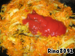 Морковь (крупную) натереть на крупной терке, лук нарезать полукольцами. Обжарить на сковороде, в конце жарки добавить кетчуп и немного воды, дать закипеть. Выключить огонь.