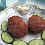 Обмытое, очищенное от сухожилий мясо пропустить через мясорубку или изрубить ножом, добавить соль, перец и сделать из него 5-6 шницелей овальной формы толщиной около 1/2 см.