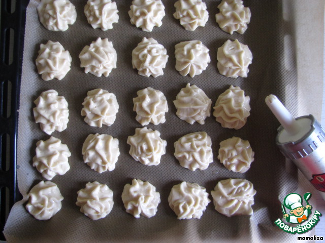 С помощью шприца или столовой ложки выложить тесто на пергамент на расстоянии друг от друга.