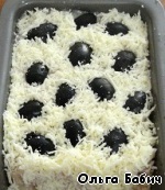 Сверху укладываем порезанные маслинки, присыпая вокруг сыром.