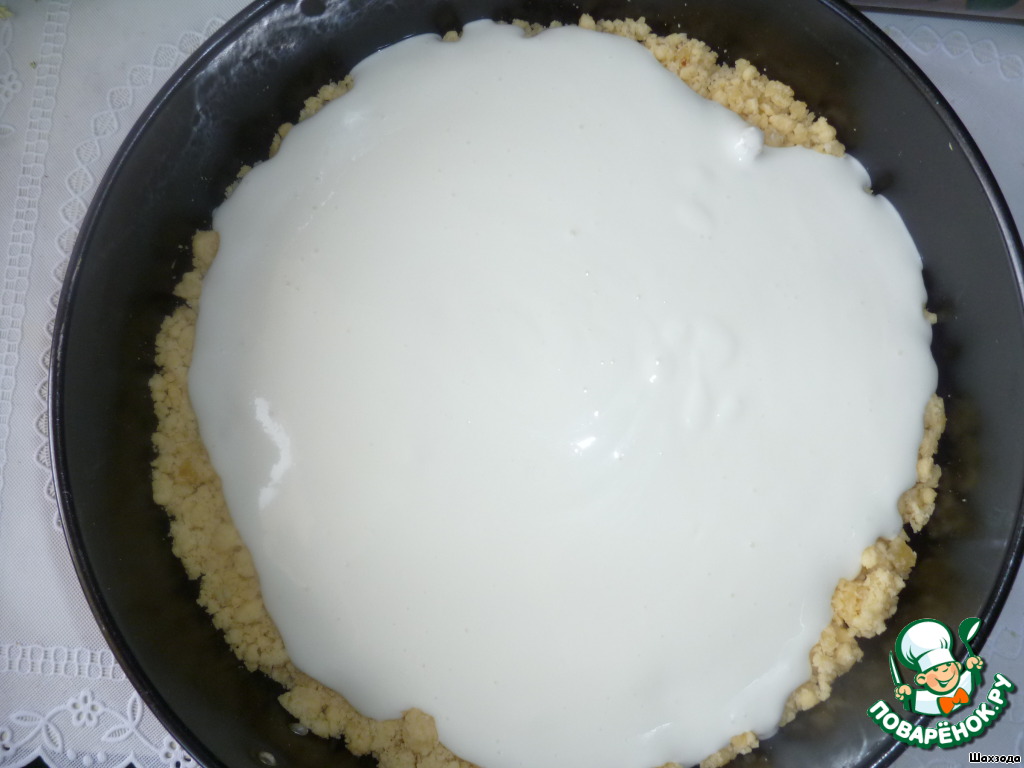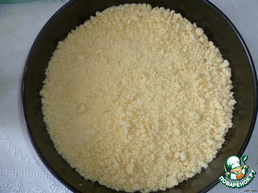 • Маргарин растереть с мукой (муку смешать с разрыхлителем) до образования крошки. Полученную крошку выложить на дно формы с разъемными бортами. Выпекать корж в течение 20-25 минут при 180градусах. Остудить в форме.