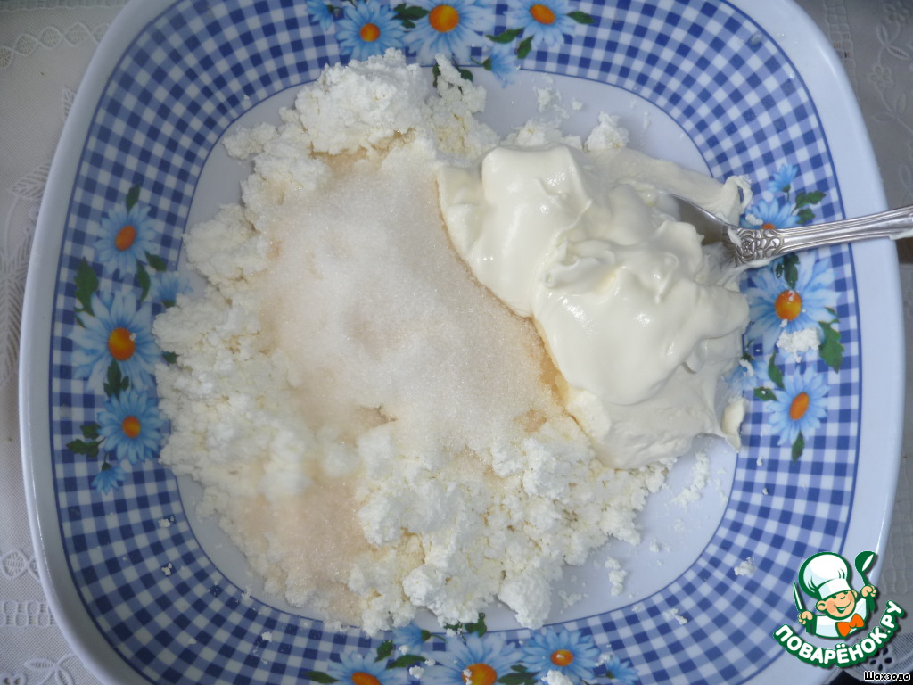 • Творог протереть через сито, добавить сахар, сметану и ванилин.