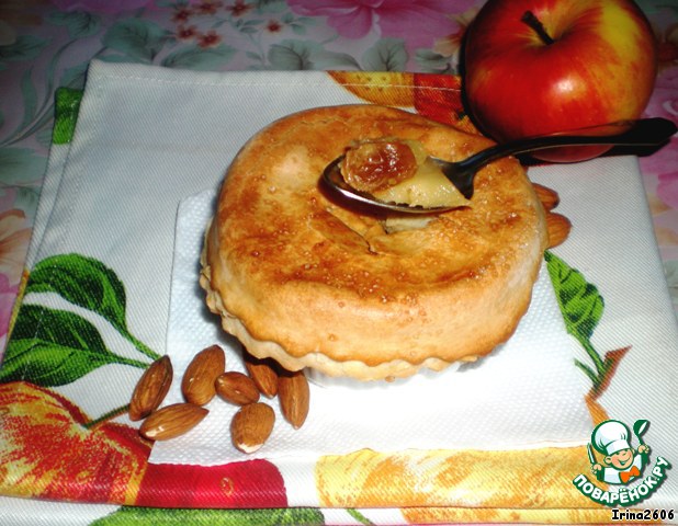 Нарезаем пласт теста на квадратики. Яблочно-пудинговую смесь выкладываем в формы. У меня получилось 5 штук. Кладем сверху квадратик теста. Чикаем пару раз ножницами - для выхода пара. Можно смазать молоком или желтком и посыпать сахаром.