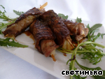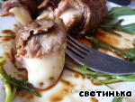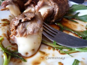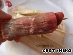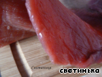 Мясо «карпаччим», т. е нарезаем о-о-очень тонко, не толще 0,5 см. Для того, чтобы так тонко нарезать, подморозьте его в морозильной камере. Затем мясо отбейте через пленку. Пожалуйста, без фанатизма, не повредите волокна.