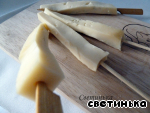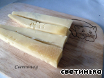 Сыр пренепременно выбирайте твердых сортов. Нарезайте его вот на такие брусочки длиной примерно 12 см.