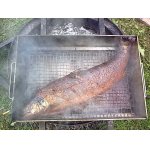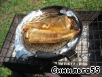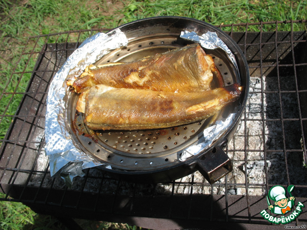 Рыба коптится в очень ароматном дыму (дыма, как если бы вы жарили блинчики) минут 30, за это время ее надо один раз перевернуть.