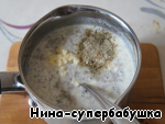 Постепенно влить горячую воду, тщательно перемешивая, чтобы не было комочков. Добавить соль и перец.