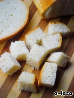 Хлеб нарезать такими же кусочками, как и предыдущие ингредиенты.