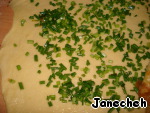Тесто с помощью кисточки смажем растительным маслом и посыпем зеленым луком.