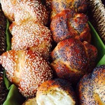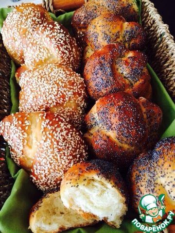 В теплой воде растворяем дрожжи, добавляем сахар, масло, соль, ванилин, разрыхлитель, муку. Замешиваем тесто, ставим в холодильник на 40-60 мин. Готовое тесто формируем и даем постоять 10 минут, смазываем взбитым яйцом и посыпаем сезамом или маком. Ставим в духовой шкаф, нагретый до 180 градусов на 15-20 минут.