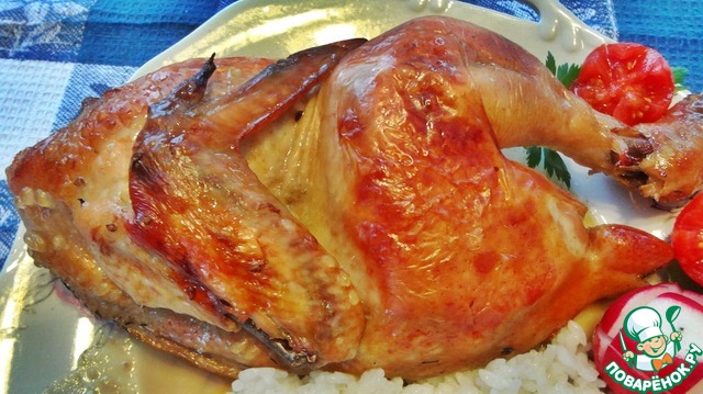 Через два с половиной часа снимаем фольгу (крышку), поливаем курочку соусом и, увеличив температуру духовки до 190 градусов, запекаем ещё минут 20 до золотисто-коричневой корочки! Ориентируйтесь на вашу духовку!!! -