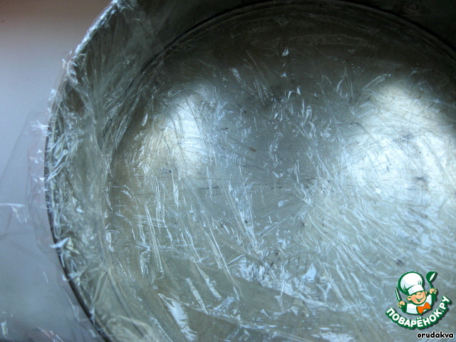 Форму застелите пищевой пленкой.