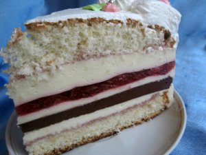 Нежность, именно такие ассоциации возникают, когда пробуешь этот торт. Ещe бы! Ведь в нeм переплетаются слои нежного баварского крема с белым шоколадом, шоколадного желе, воздушного бисквита и карамелизованной клубники…