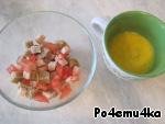 Режем кубиками колбасу, хлеб и помидор, смешиваем. Взбиваем яйцо.