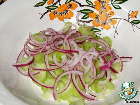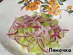Лук нарезать тонкими, почти прозрачными полукольцами.