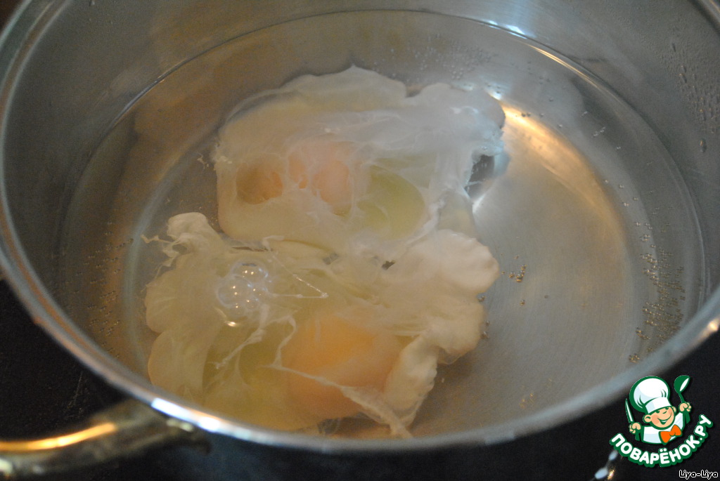 В кастрюлю наливаем питьевую воду. Доводим до кипения. Добавляем соль и уксус. Огонь немного убавим и аккуратно вливаем яйца (да, прямо в воду). |