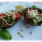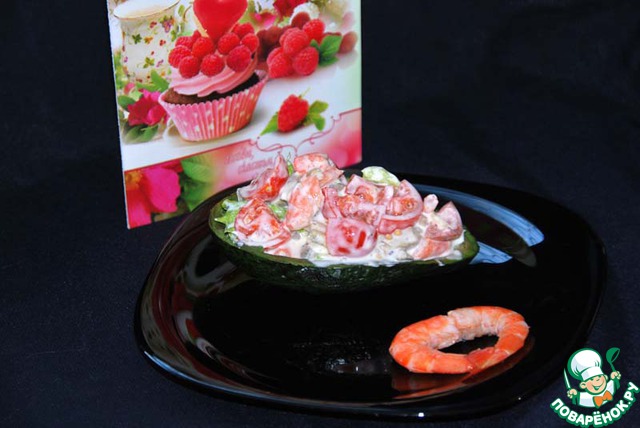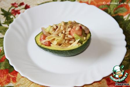 Готовый салат разложить в половинки авокадо (или в салатницу), полить сверху соусом, посыпать кедровыми орешками (их можно предварительно обжарить) и подавать.