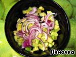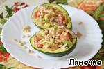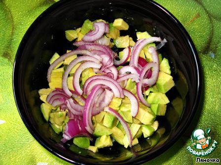 Авокадо разрезать вдоль на половинки, вынуть мякоть, порезать ее кубиками и сбрызнуть лимонным соком.