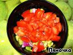 Помидоры обдать кипятком, снять кожицу, вынуть семена и нарезать кубиками.